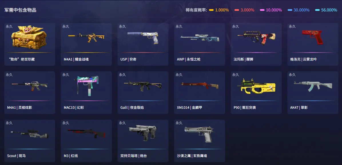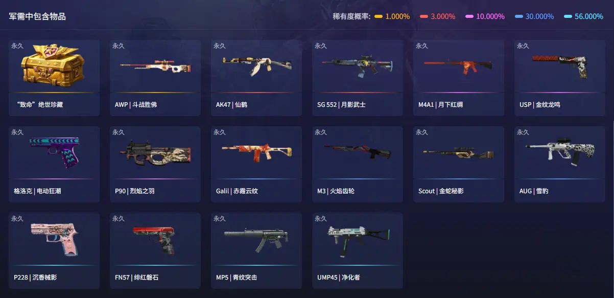 玩家在平台进行CS1.6游戏后可掉落武器箱,开启箱子后,将获得不同武器的永久皮肤道具。
